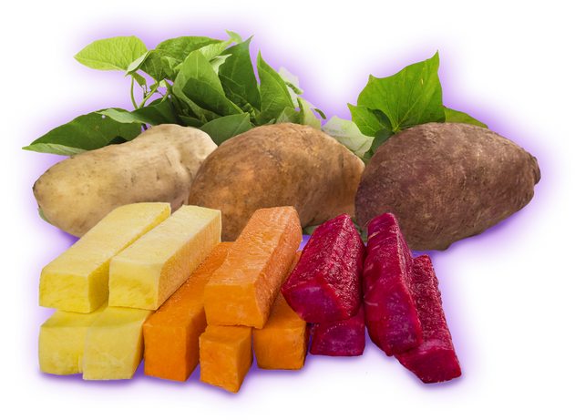 OUR PURPLE SWEET POTATOES, RICH IN ANTIOXIDANTS, PROMOTE HEART HEALTH, WHILE THE WHITE VARIETY OFFERS DIETARY FIBER FOR DIGESTION. THE ORANGE SWEET POTATOES ARE FULL OF BETA-CAROTENE, BOOSTING IMMUNITY AND EYE HEALTH.